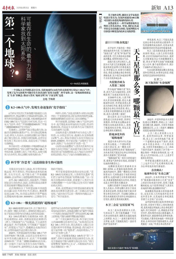 不过,尽管媒体将K2-18b称为“第二个地球”,但科学家强调:即使这里存在生命,其化学基础也可能与地球生物完全不同,“我们需要警惕‘地球中心主义’——不能假设外星生命必须像我们一样。”